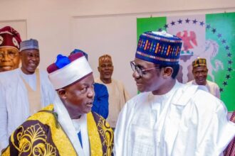 Governor Mai Mala Bini of Yobe state,congratulates the new Emir of Gudi.