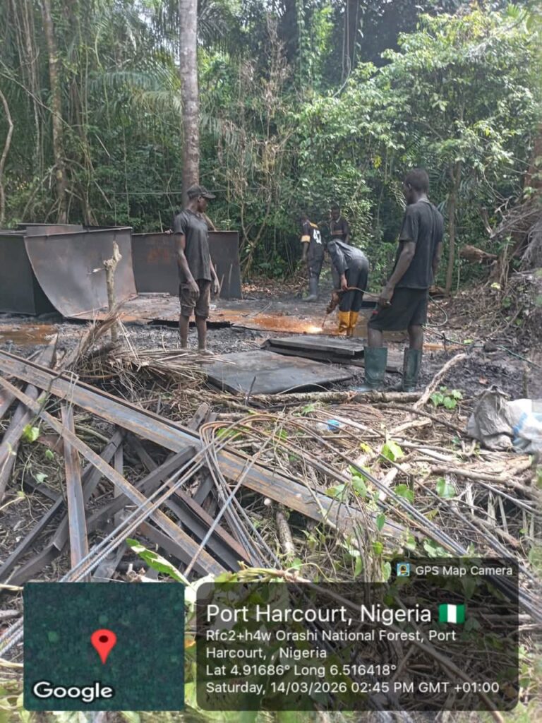 The Nigerian Navy earlier today, Saturday 14 March 2026, destroyed a reactivated illegal refinery site in Okolomade Community, Abua-Odual Local Government Area of Rivers State.