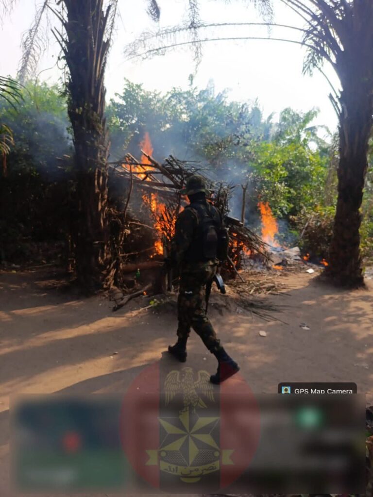 Acting on credible intelligence, on 11 March 2026, troops stormed several hideouts believed to be used by suspected kidnappers and ritualists operating with Indigenous People of Biafra and Eastern Security Network within the forested areas of Olokoro in Abia State.