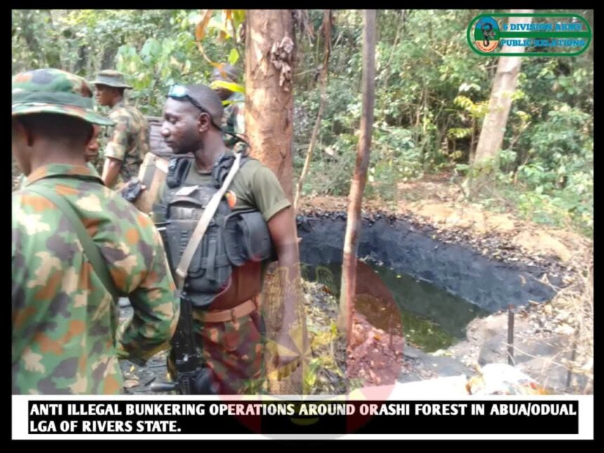 In Rivers State, at Ogale Community in Eleme LGA, troops discovered 350 sacks filled with over 10,500 litres of stolen crude. Around Okarki Forest in Ahoada West LGA, troops destroyed two illegal refining sites, with sacks and a reservoir filled with over 3,000 litres of stolen crude recovered.